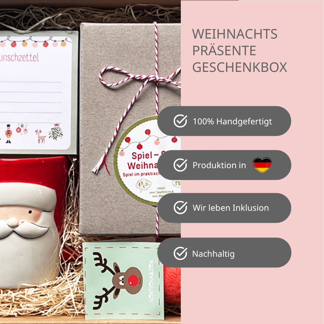 Christmas Gift Ideas: The Enchanting Christmas Surprise Gift Box Are you looking for a loving, special, and sustainable Christmas gift idea? Then our Christmas Surprise Gift Box is just the thing! This festively designed box is full of little surprises that will make hearts beat faster, whether for friends, family, colleagues, or yourself. With this gift box, you give more than just things: you give memories, anticipation, and true Christmas spirit, all combined in a box that brings joy and does good. Contents: Wish list pad for noting down wishes City Country Christmas Party Games Set Marshmallow Rudy Reindeer Nose for snacking XL Santa Porcelain Mug for maximum enjoyment